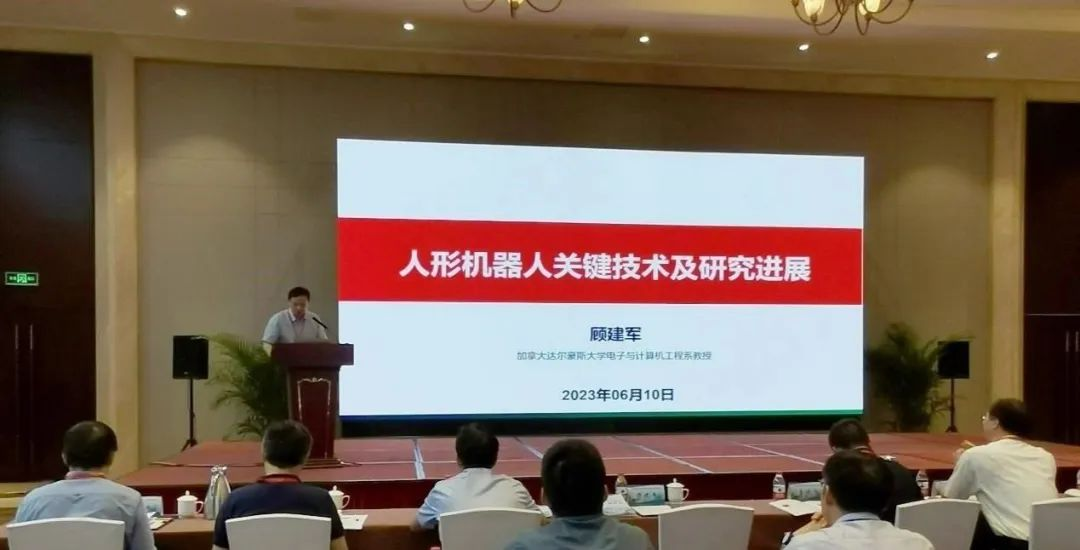 开幕式后是大会报告环节。加拿大工程学院院士、加拿大达尔豪斯大学顾建军教授作了题为“人形机器人关键技术及研究进展”的报告,介绍了当前人型机器人研究的背景和对不同的时间段的较出名的人型机器人进行点评,指出了人型机器人发展中的瓶颈及核心技术的难点,分享了国内一些实验室的人型机器人的研究成果并对未来机器人的发展做出展望。