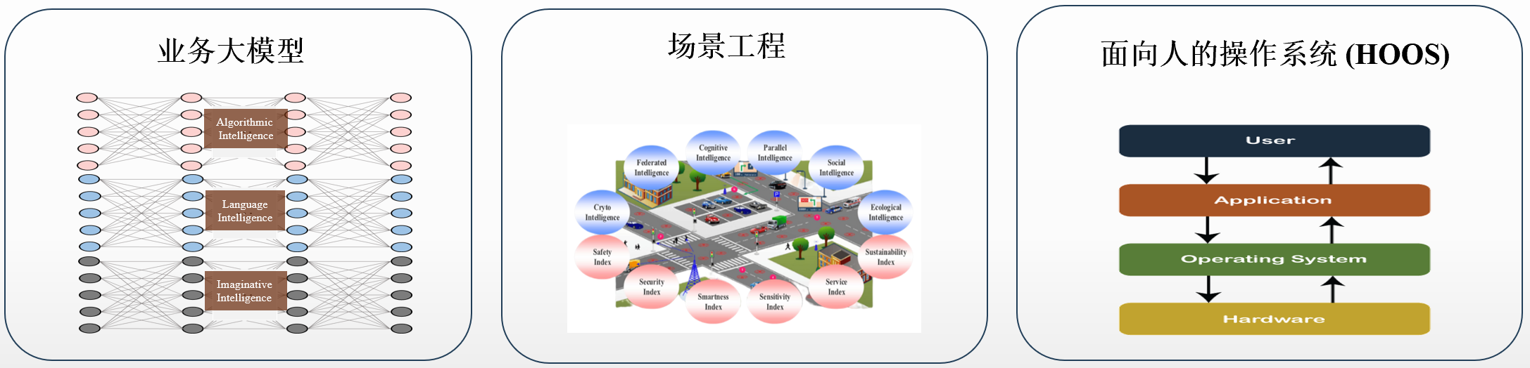如图6所示,当前的大模型呈现为“大问题,大模型”的形式,能够回答几乎所有问题,但未来必然会发展为“小问题,大模型”的业务大模型的模式,即围绕具体问题进行更加精准的解答,最终由人类作为主宰进行选择。在这一逻辑下,未来公司与组织最重要的知识产权与资产将是“场景工程”,其核心在于教育案例、管理案例与工程案例的场景化表达。如果数字员工、机器人员工与人类员工在这些场景中的表现不能达到90分甚至95分以上,则无法胜任重要岗位。当然,每个人仍然拥有生存权,这意味着未来每个人自出生便拥有基本收入保障(Universal Basic Income, UBI),并辅以普遍人道关怀,使其享有基本体面生活(Universal Humanitarian Income, HBI),但若不努力则只能维持在基本收入保障水平。最终,计算机的操作系统与人类的管理系统将分别向上与向下发展,最终合二为一,构成面向三类人类的统一系统(Human Oriented Operating Systems, H₂O),涵盖优先权、调度机制、任务分配与中断机制,由此方能迈向可持续发展的未来。
